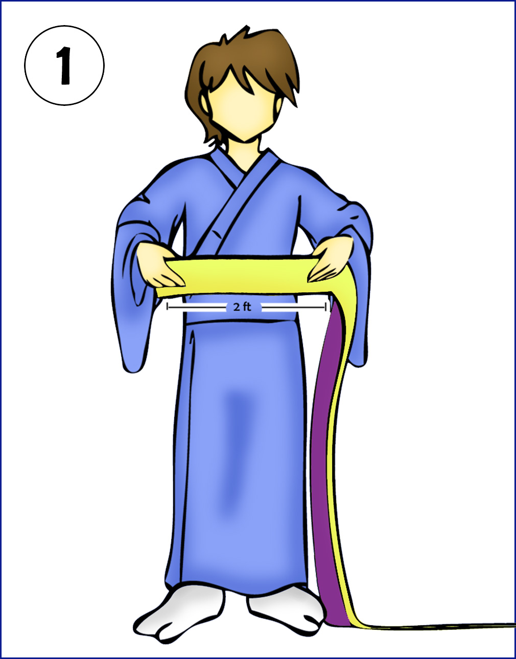 1) Hold one end of the Hanhaba Obi in front of you, and measure approximately two feet in length.