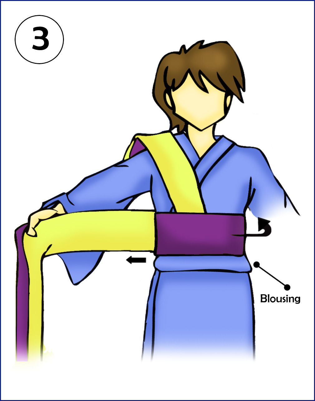 2) Place this section of obi over your right shoulder (to keep it out of the way for now), and begin wrapping the rest of the obi around your back. Make sure the obi is placed over the kimono blousing.