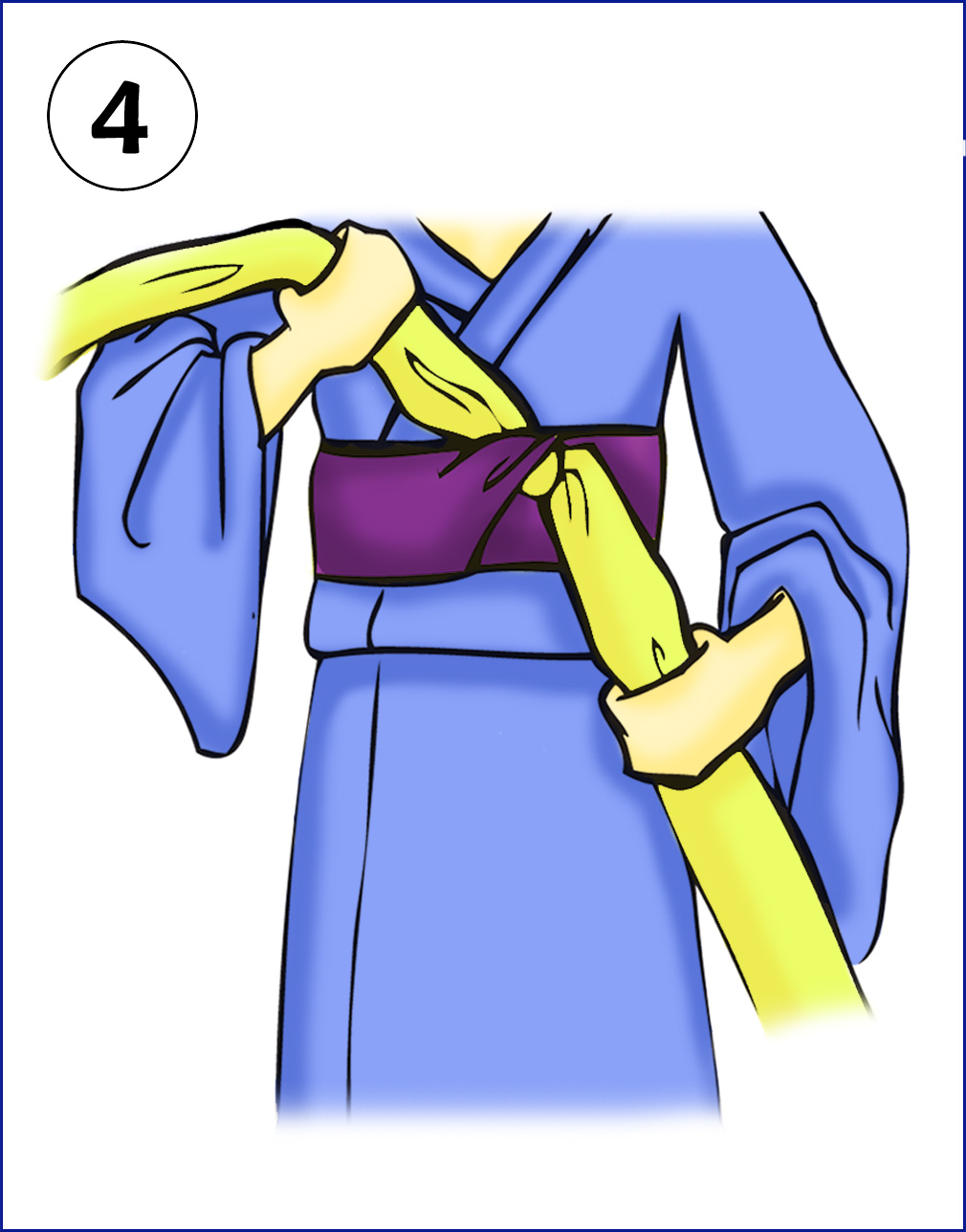4) Now, take the long end of the obi that you have been wrapping around yourself, as well as the shorter end that has been resting over your shoulder. Tie a single knot. Then, place the shorter end of the obi over your shoulder once more to keep it out of the way for the next step.