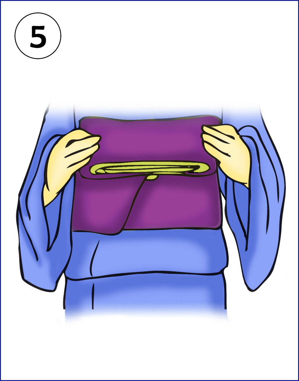 7) (a) Take the shorter part of the obi and bring it down over the center of the rectangle / pillow. (b) Next, tuck the short end of the obi under the rectangle / pillow, and tug it up firmly behind the knot, cinching the bow. (Do this step twice.)