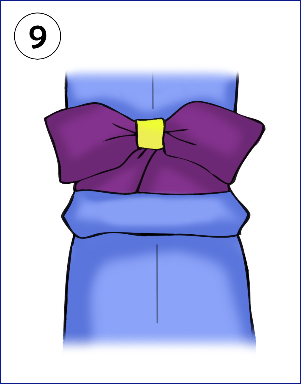 9) Lastly, twist the whole obi around your body until the bow is centered on your back. Tuck the remaining tail of the obi bow up into the obi layers.