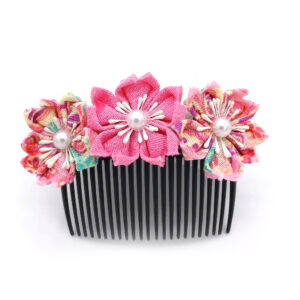 Chirimen Kanzashi Hair Comb with Large Blooms in Black and Pink and Red
