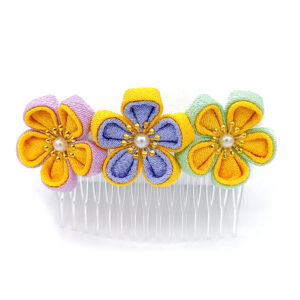 Chirimen Kanzashi Hair Comb with Large Blooms in Yellow Lavender and Sky Blue