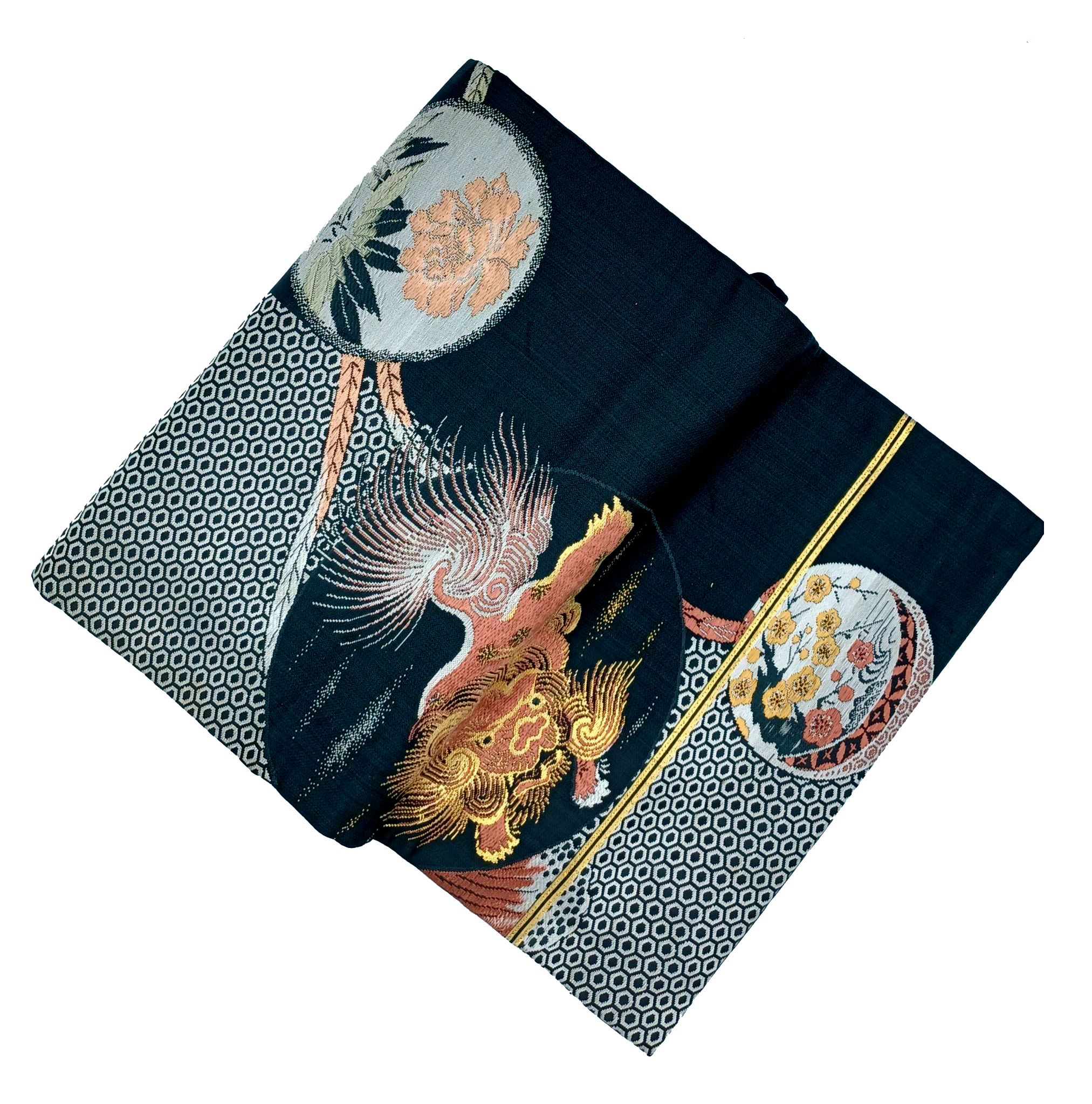 Black with Fierce Shi Dog Antique Nagoya Obi. Obi in this category are circa Meiji, Taisho, or early Showa Periods. SOLD AS-IS AND WITH ALL FAULTS.