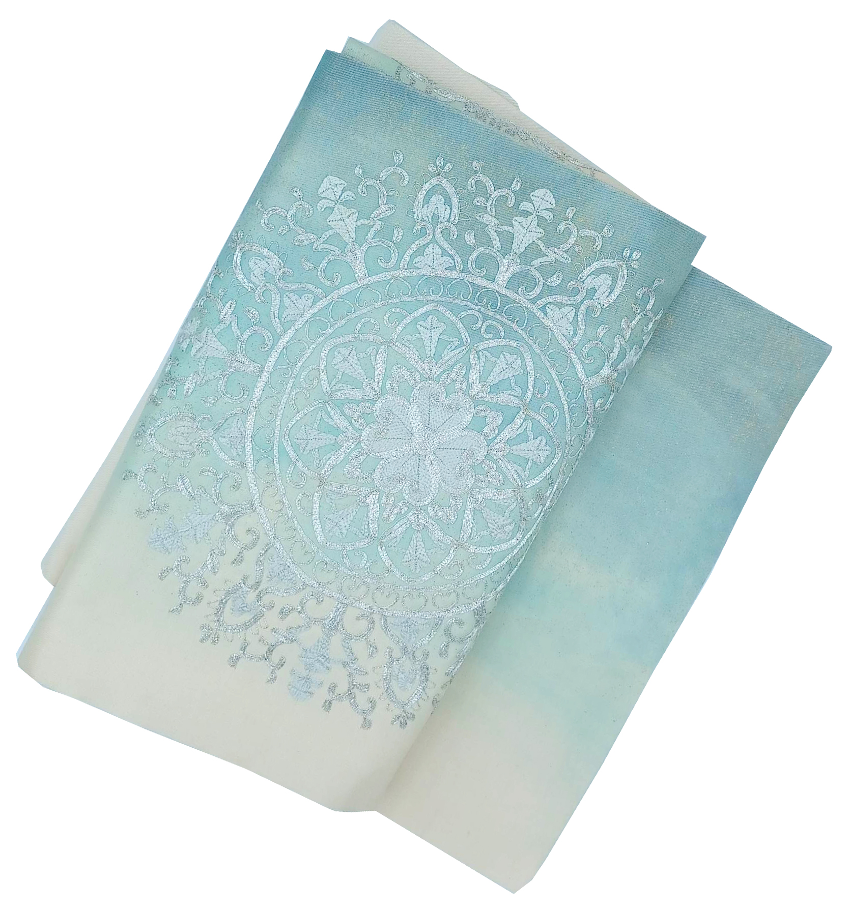 Ice Blue Silver with Hand-Couched Embroidered Mandala Nagoya Obi. Vintage Item. SOLD AS-IS AND WITH ALL FAULTS.