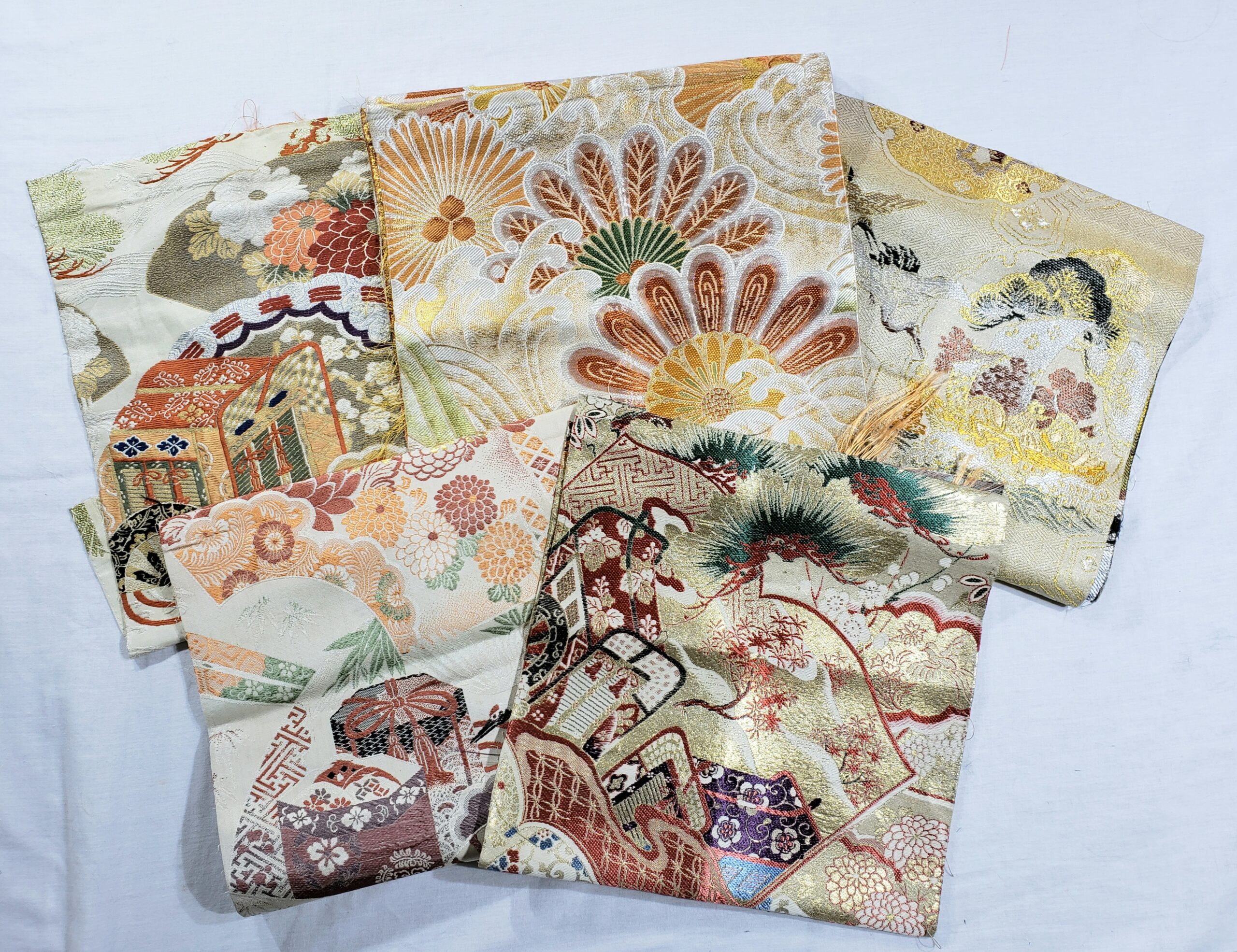 This bundle of vintage Japanese damask was cut from vintage maru (wide, double-sided) obi. The fabrics are perfect for creating bags, pouches, small upholstery projects, wall art, doll clothes, and more! Japan is renown for creating gorgeous obi, and now you can use these excellent silk and rayon fabrics in your projects. Working with obi fabrics is an experience you cannot get when you buy brocades or damasks outside Japan, so please take advantage of this amazing opportunity to get your hands on the best of the best! Each fabric is graded at either A (excellent) or B (very good) condition. Any flaws allowed are minor.
