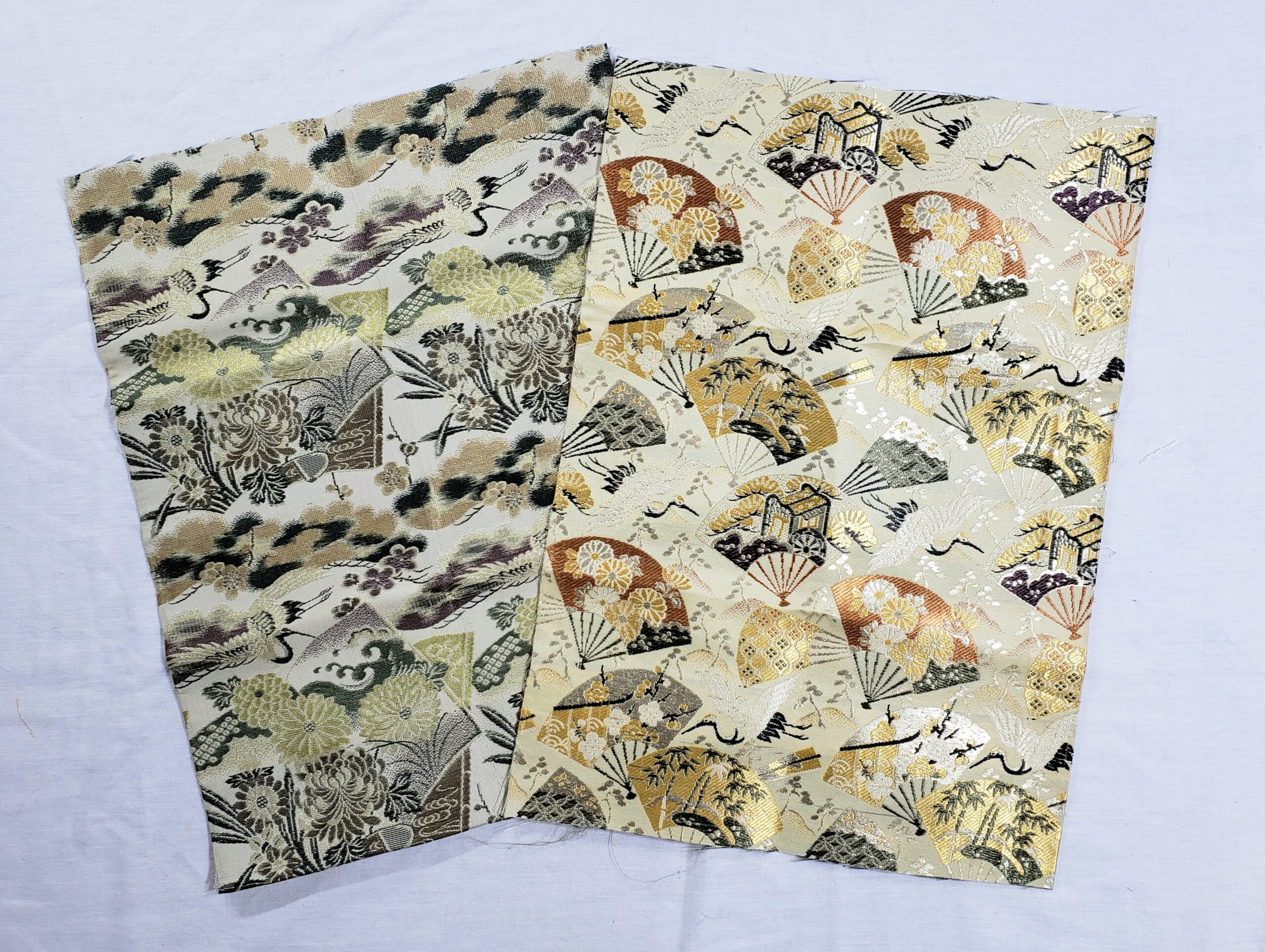 This bundle of vintage Japanese damask was cut from vintage maru (wide, double-sided) obi. The fabrics are perfect for creating bags, pouches, small upholstery projects, wall art, doll clothes, and more! Japan is renown for creating gorgeous obi, and now you can use these excellent silk and rayon fabrics in your projects. Working with obi fabrics is an experience you cannot get when you buy brocades or damasks outside Japan, so please take advantage of this amazing opportunity to get your hands on the best of the best! Each fabric is graded at either A (excellent) or B (very good) condition. Any flaws allowed are minor.