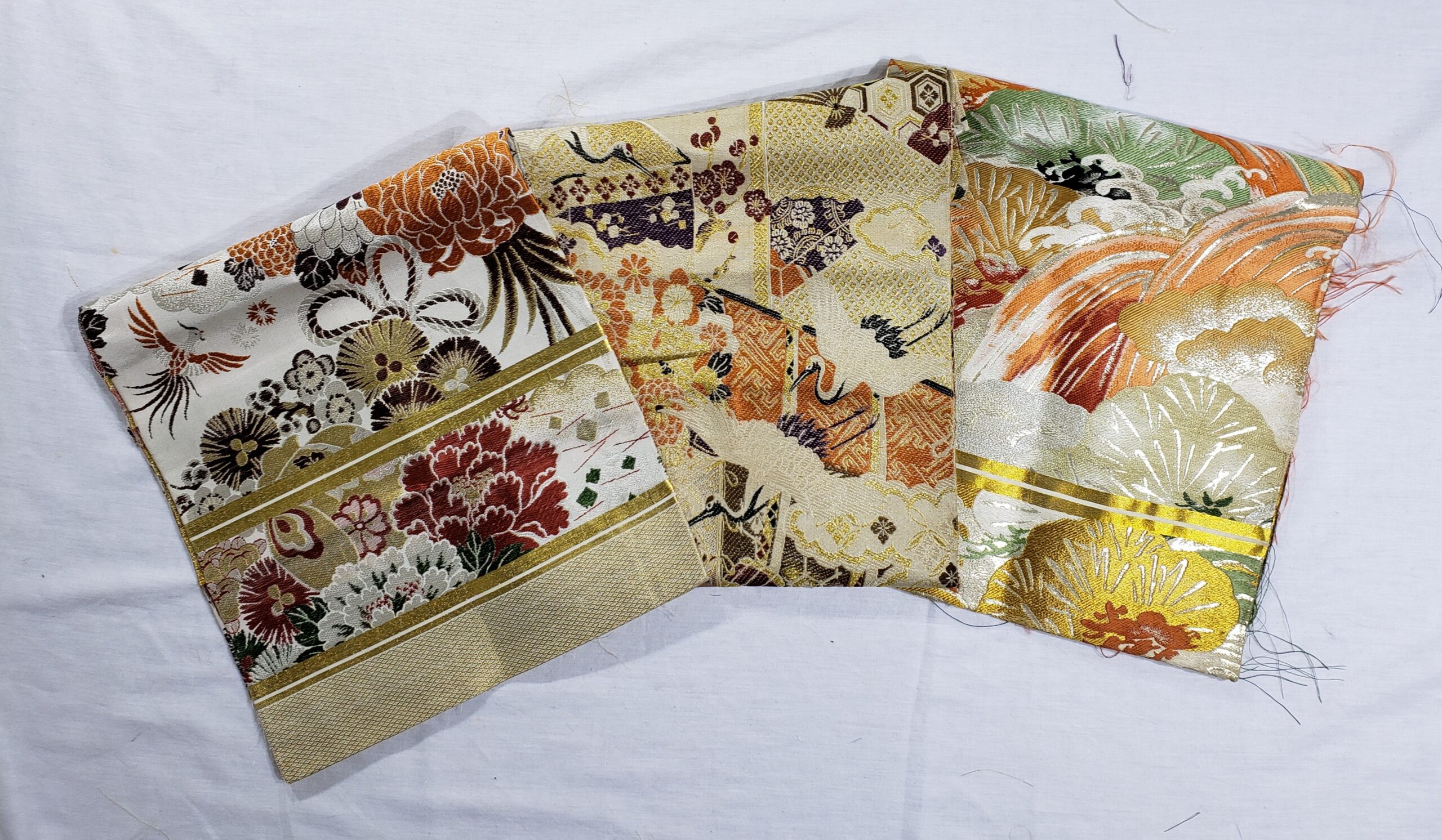 This bundle of vintage Japanese damask was cut from vintage maru (wide, double-sided) obi. The fabrics are perfect for creating bags, pouches, small upholstery projects, wall art, doll clothes, and more! Japan is renown for creating gorgeous obi, and now you can use these excellent silk and rayon fabrics in your projects. Working with obi fabrics is an experience you cannot get when you buy brocades or damasks outside Japan, so please take advantage of this amazing opportunity to get your hands on the best of the best! Each fabric is graded at either A (excellent) or B (very good) condition. Any flaws allowed are minor.