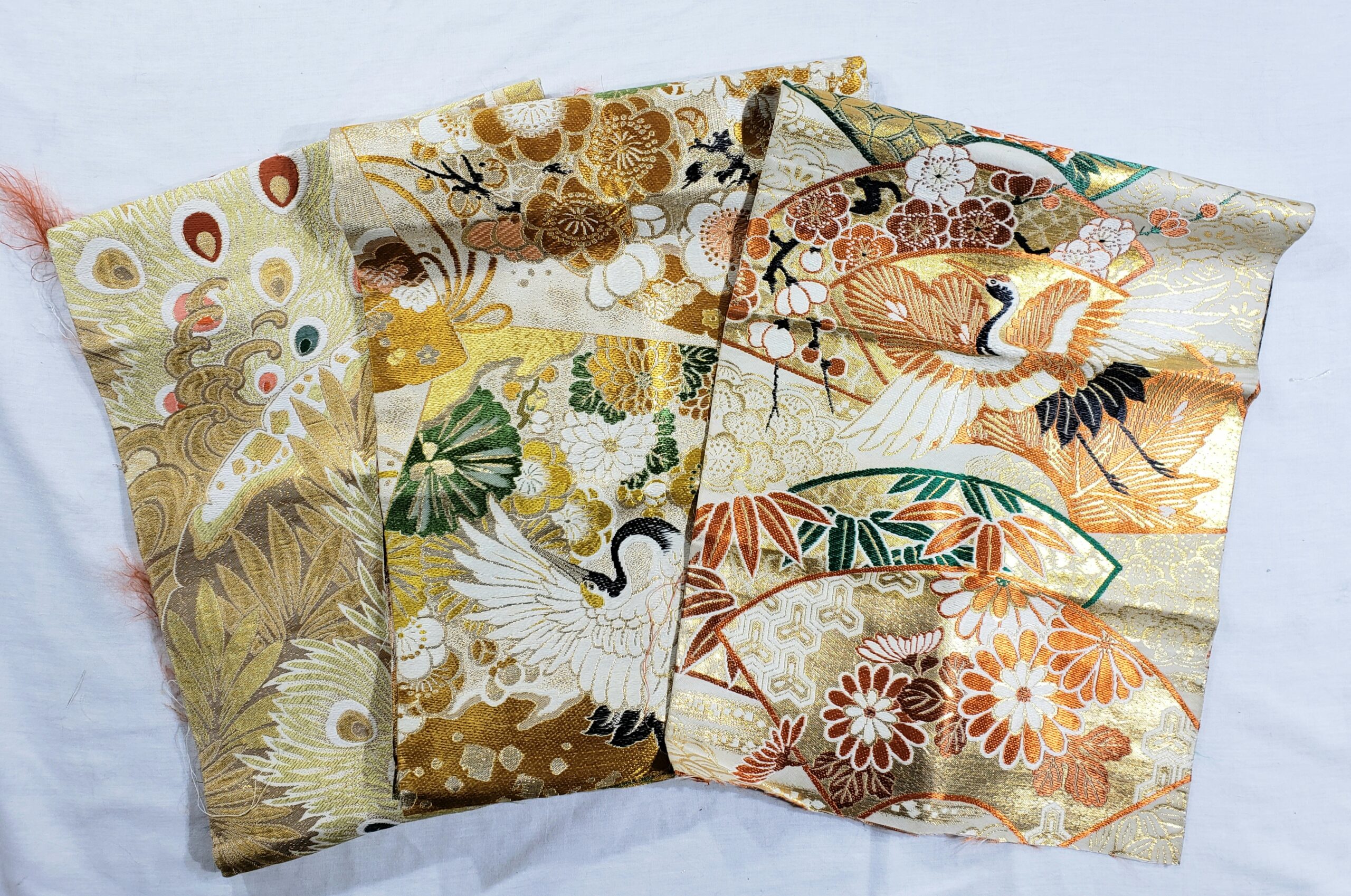 This bundle of vintage Japanese damask was cut from vintage maru (wide, double-sided) obi.  The fabrics are perfect for creating bags, pouches, small upholstery projects, wall art, doll clothes, and more!  Japan is renown for creating gorgeous obi, and now you can use these excellent silk and rayon fabrics in your projects.  Working with obi fabrics is an experience you cannot get when you buy brocades or damasks outside Japan, so please take advantage of this amazing opportunity to get your hands on the best of the best!  Each fabric is graded at either A (excellent) or B (very good) condition.  Any flaws allowed are minor.