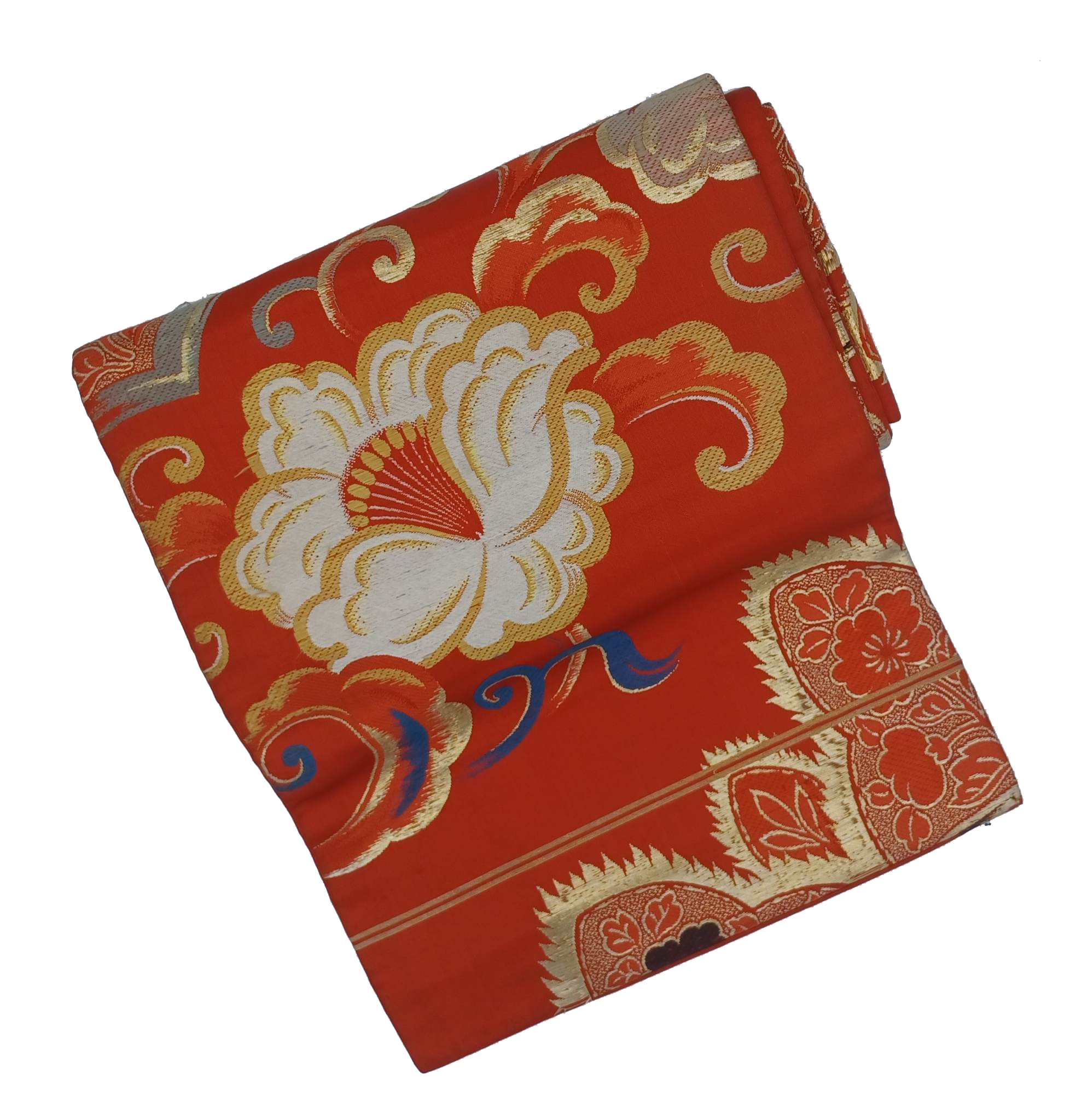Russet with Stylized Camellia Flowers Antique Nagoya Obi. Obi in this category are circa Meiji, Taisho, or early Showa Periods. SOLD AS-IS AND WITH ALL FAULTS.