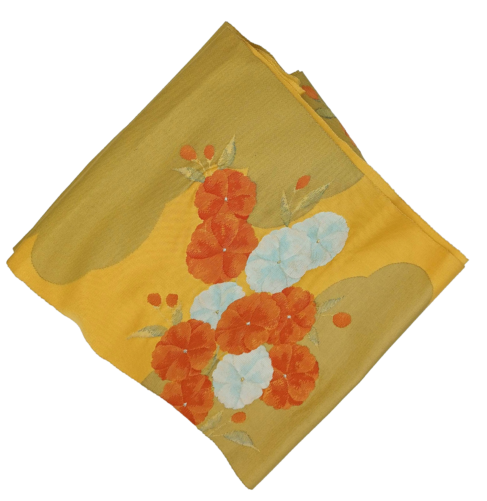Stunning Woven Cherry Blossoms in Orange and White Against a Yellow Background Nagoya Obi. Vintage Item. SOLD AS-IS AND WITH ALL FAULTS.